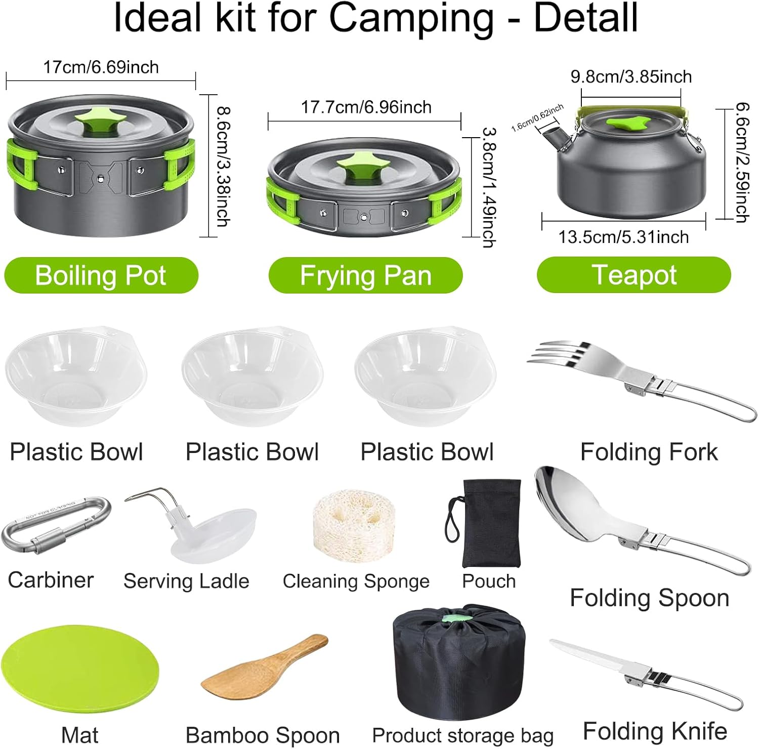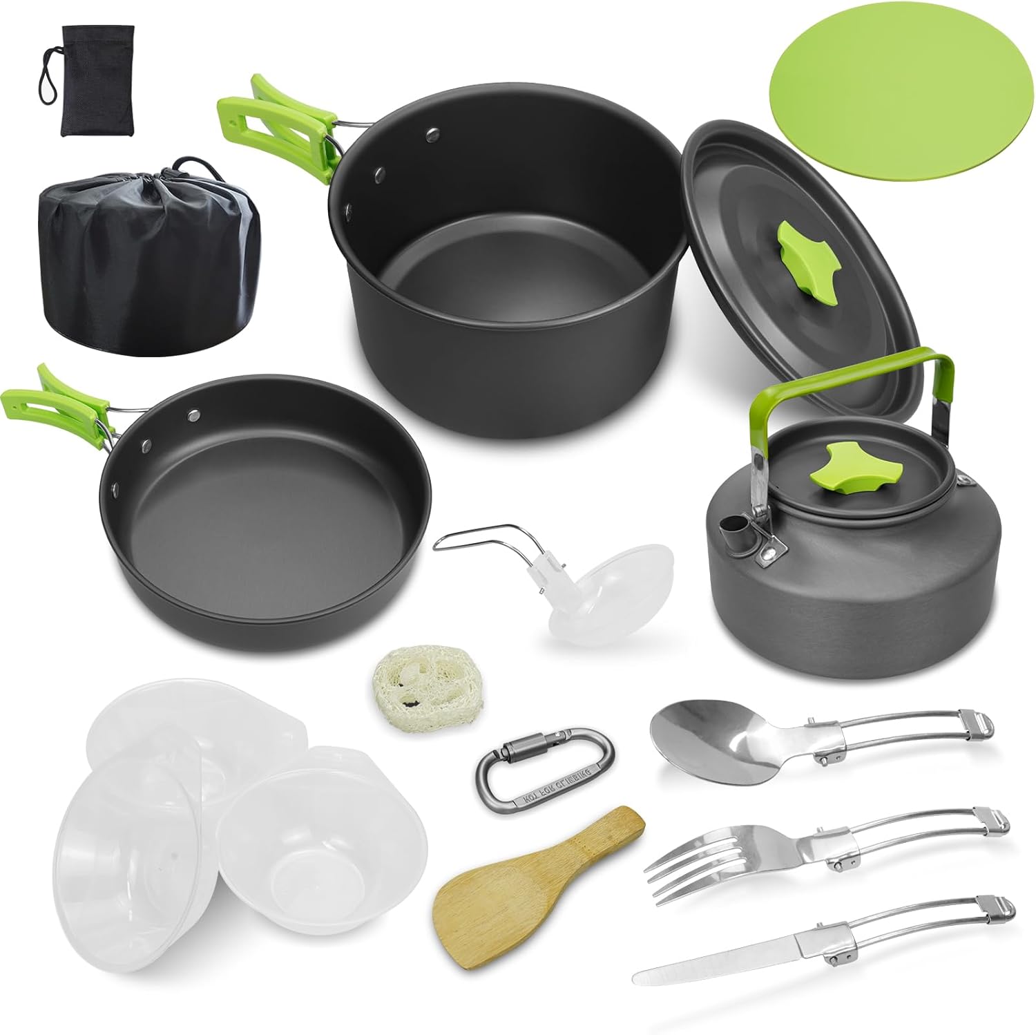 مقلاة نون ستك، قدر غلي، إبريق ماء، سكين قابلة للطي، شوكة، ملعقة، 3 صحون طعام، مغرفة تقديم، ملعقة بامبو، إسفنجة تنظيف، كارابين، وحقيبة نايلون للحمل.