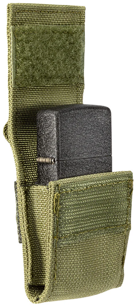 متين، عملي، وصُنع في أمريكا. هذا الطقم يجمع بين ولاعة Zippo الأصلية بتشطيب Black Crackle® الشهير، الذي اكتسب سمعته خلال الحرب العالمية الثانية، مع بيت تكتيكي مستوحى من الطابع العسكري، مثالي للحياة النشطة والرحلات والمغامرات. الجراب يحفظ الولاعة بثبات ويعمل مع أنظمة MOLLE وأحزمة الحمل المختلفة، ليكون رفيقك في كل مكان.   محتويات الطقم :