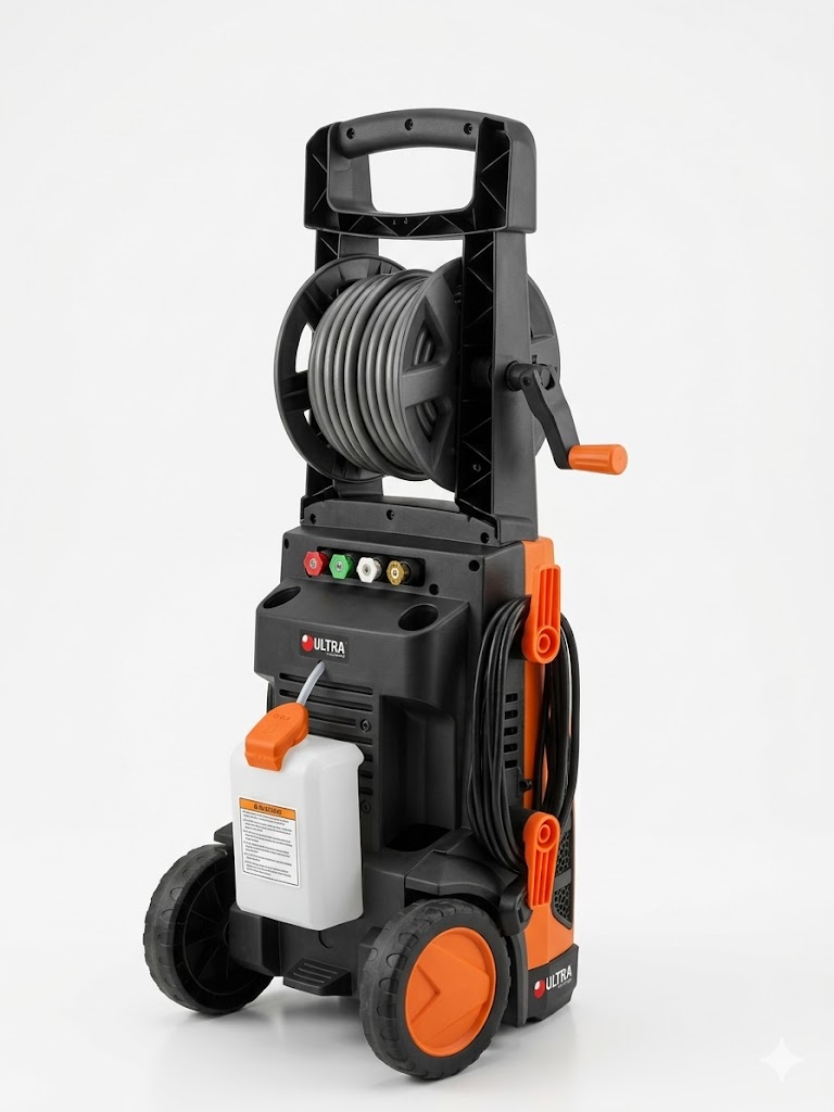 بكرة خرطوم مدمجة (Hose Reel): يحتوي على بكرة علوية بـ “هندل” يدوي لطي خرطوم الضغط بسهولة ومنع تشابكه، مما يحافظ على عمر الخرطوم ويوفر مساحة التخزين.